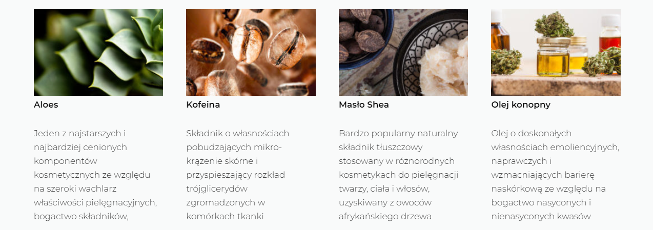 Poczuj się świetnie w swojej skórze. Umiemy spełniać jej pragnienia o gładkości, jędrności, idealnym nawilżeniu, regeneracji i wzmocnieniu. Jak? Za sprawą wyselekcjonowanych składników: sok z aloesu, masło Shea i kakaowe, olej z konopi, zielona herbatę, witaminy z grupy B, które poprawiają funkcjonowanie skóry, zatrzymują wodę w tkankach oraz wzmacniają barierę naskórkową. Dodatkowo kofeina wspomaga mikrokrążenie i spalanie trójglicerydów, aby jednocześnie wpływać na zmniejszenie skórki pomarańczowej. Poczuj radość z tego, że codzienność pachnie teraz delikatną śmietanką, że skóra odzyskuje świetną formę, że jest doskonale nawilżona i chroniona przed przyspieszonym starzeniem.